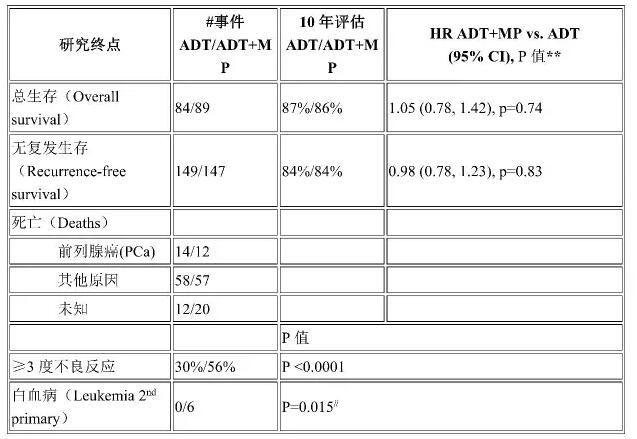 研究结论:两组的生存数据都高于预期,加用MP方案增加白血病风险。没有证据表明两年辅助ADT加用MP方案改善前列腺癌特异性生存。