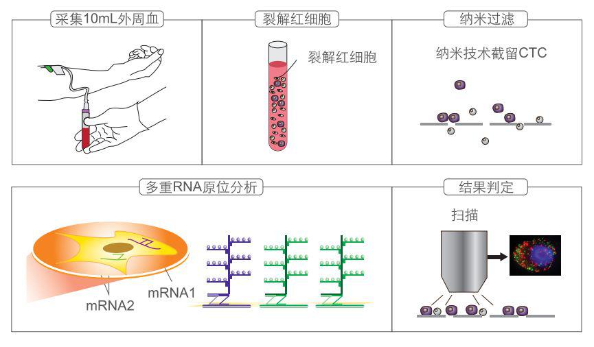 由于CTCs在外周血中的数量很少,每105-107个有核细胞中才有一个CTCs,因此对 CTCs的检测技术要求更为准确、敏感。CTCs的检测方法主要分为两部分:CTC富集技术和CTC检测技术。其中一种富集、检测方法如下示意图: