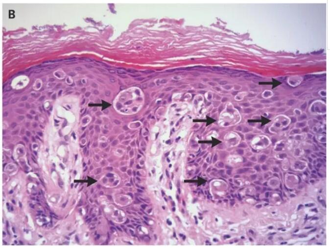▲受累皮肤组织切取活检可见表皮下有典型的Paget细胞浸润,细胞大,呈圆形或椭圆形,胞浆嗜酸性,核突出,核仁明显(图B箭头所指)。