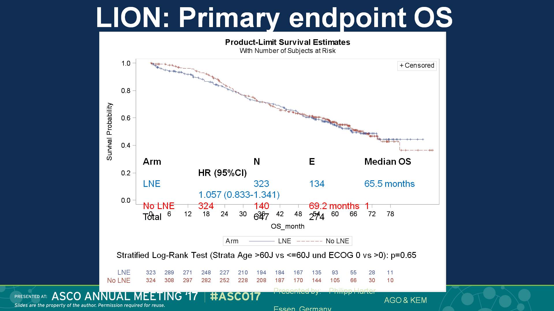 Ritu Salani教授:临床评价(术前影像学检查及术中探查)无淋巴结转移的晚期卵巢癌(AOC)在获得肉眼完全切除后,是否需要行盆腔及腹主动脉旁淋巴结清扫术(LNE)?2017 ASCO报告的随机、前瞻LION研究发现, 这些卵巢癌患者行盆腔及腹主动脉旁淋巴结清扫未能改善生存且风险增加(摘要号5500)。研究者规定患者手术必须是完全切除(完全切除率为100%)。未行淋巴结清扫的患者和接受系统淋巴结清扫的患者相比,PFS和OS没有差异。研究结果与既往预期相反,让人惊讶。淋巴结清扫甚至会给患者增加伤害,造成围手术期并发症增加(比如感染、再次手术、增加出血量、增加输血比例等),增加60天内死亡率(3.1% vs. 0.9%)。