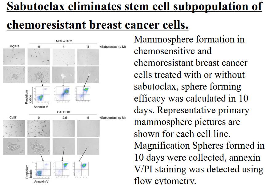 研究结果表明,单药Sabutoclax 能够通过诱导细胞凋亡,有效杀伤乳腺癌化疗耐药细胞MCF-7/A02与CALDOX,并有效调控凋亡相关蛋白Bim、Puma、BAX与survivin的表达。而且,Sabutoclax能抑制MCF-7/A02与CALDOX细胞中肿瘤干细胞比例及特性,包括CD44+、CD24-细胞群及ALDH1+细胞群比例的降低,细胞球囊形成能力及软琼脂克隆形成能力。