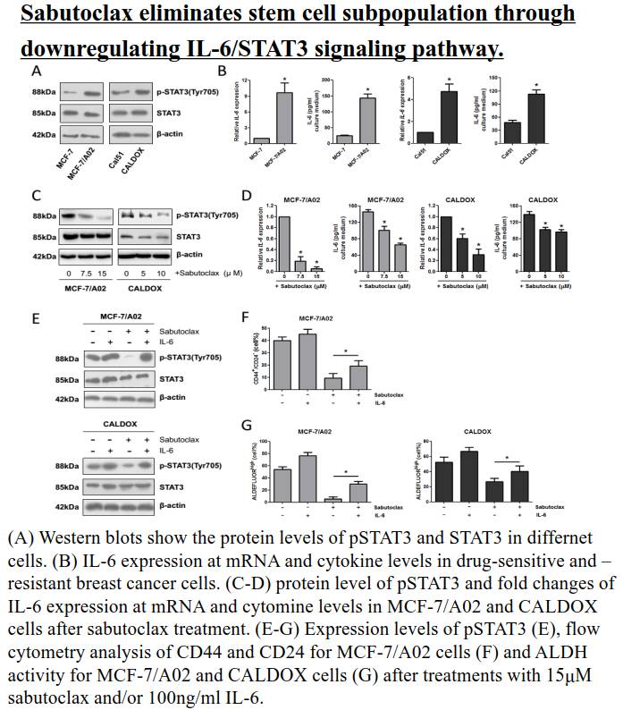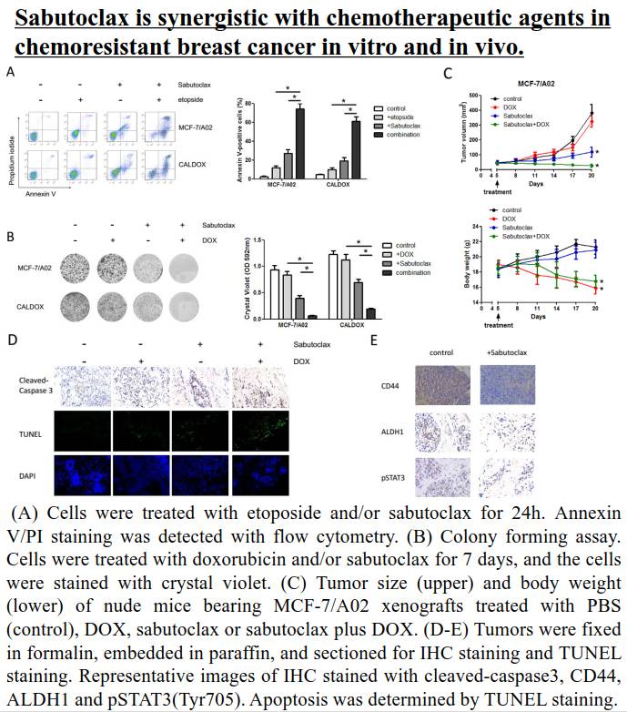 相关机制研究表明Sabutoclax能够显著抑制IL-6/STAT3信号通路的活性从而抑制肿瘤干细胞特性。研究结果进一步证明Sabutoclax联合化疗药(阿霉素/依托泊苷)后对乳腺癌化疗耐药细胞在体内外的杀伤效果具有协同增效作用。
