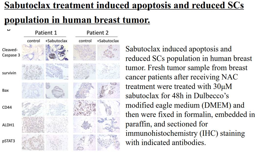值得注意的是,本研究中采集了9例乳腺癌患者的新鲜癌组织,在体外用Sabutoclax处理48小时后能够显著增加组织中cleaved caspase3的表达,即诱导癌细胞凋亡的发生;同时抑制Survivin的表达,增加Bax表达,抑制CD44、ALDH1及pSTAT3(Tyr705)的表达,调控作用与Sabutoclax在乳腺癌细胞中得到的结果一致。