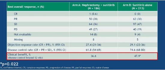 目前转移性肾癌的标准一线治疗是减瘤性肾切除联合舒尼替尼,比较减瘤性肾切除和靶向治疗用于转移性肾癌患者一线治疗的CARMENA研究(摘要LBA3)