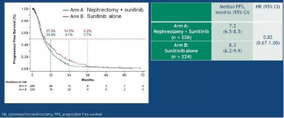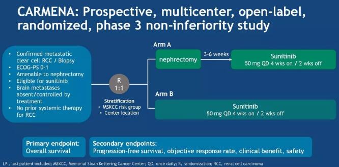 CARMENA是一项纳入了450例患者的随机前瞻性III期非劣效临床试验,患者被随机分配到两个组:减瘤性肾切除联合舒尼替尼标准治疗组(A组)和舒尼替尼单用组(B组)。标准治疗组(A组)入组了226名患者,实验组(B组)224例患者。主要终点是总生存(OS),次要终点包括PFS、有效率、临床获益率(疾病控制超过12周)和安全性。