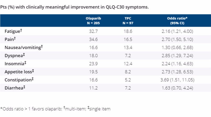 2018年ASCO壁报展示了两项基于OlympiAD研究的后续分析。其中一项分析对于合并不同内脏转移患者的总体疗效,结果显示奥利帕利单药治疗与医生选择的单药化疗(TPC)相比,在有特定内脏转移的mBC患者中ORR分别为:肺/胸膜,61.2%比22.2%; 肝脏,59.5%vs 25.8%; 和脑/中枢神经系统转移64.7%和20.0%。PFS和ORR结果与既往总体分析结果基本一致(表1);另一项研究同样基于OlympiAD,应用EORTC QLQ-C30 (QLQ-C30)生存质量问卷调查评估患者治疗后相关药物副作用;发现奥拉帕利组患者在乏力、疼痛、恶心/呕吐、呼吸困难、失眠、食欲丧失、便秘和腹泻等相关不良事件的表现均优于化疗组(表2)。