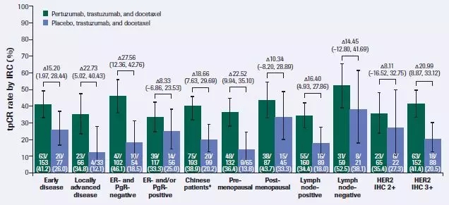 分析结果显示曲帕双靶组相对于对照组, tpCR显著提高,接近翻倍(39.3% vs 21.8% , P=0.0014),这一结果与NEOSPHERE研究结果高度一致。