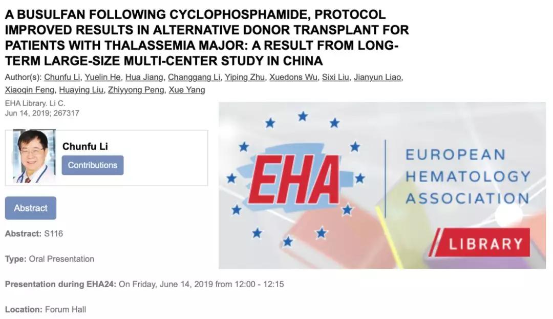 李春富教授领衔的有关“环磷酰胺后续白消安,固定细胞剂量和多药物方案改善了重型地中海贫血患者变更供者移植的效果”的临床研究获选了今年大会主会场(唯一中国人)口头报告。该项研究由南方医科大学南方医院、广州市妇女儿童中心、深圳市儿童医院、四川大学华西第二医院和南方春富(儿童)血液病研究院通力合作完成。