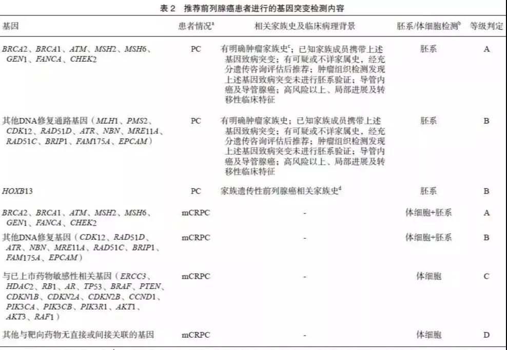 (4)对于所有转移性去势抵抗性前列腺癌(metastatic castration-resistant prostate cancer,mCRPC)患者,推荐进行至少包含DNA修复基因胚系及体细胞变异的检测。