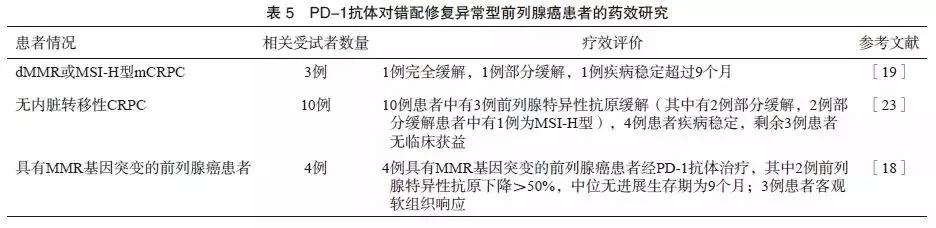 既往研究认为,免疫检查点抑制剂在前列腺癌或CRPC患者中疗效不佳。PD-1抗体帕博利珠单抗已于2017年5月获得美国FDA批准用于不可切除或转移性dMMR或MSI-H型实体瘤治疗。多项研究中纳入的有限数量的dMMR/MSI-H型前列腺癌患者均显示对帕博利珠单抗有较高的敏感性(表5)。《NCCN指南》推荐局部进展、转移性及mCRPC患者进行MSI-H及dMMR检测,如确诊为MSI-H或dMMR型,mCRPC患者可在特定治疗阶段考虑帕博利珠单抗治疗(2B类),同时需要进行遗传咨询及考虑林奇综合征(Lynch syndrome)的相关基因检测,进一步的MMR基因胚系变异检测可以明确其遗传性改变规律。考虑到先行免疫组织化学或MSI再根据结果决定行胚系变异检测的时间比较久,对于符合阿姆斯特丹标准或中国人林奇综合征家系标准(详见《遗传性结直肠癌临床诊治和家系管理中国专家共识》)、且有意愿将胚系变异的检测前置的前列腺癌患者可以考虑直接进行胚系变异检测 。