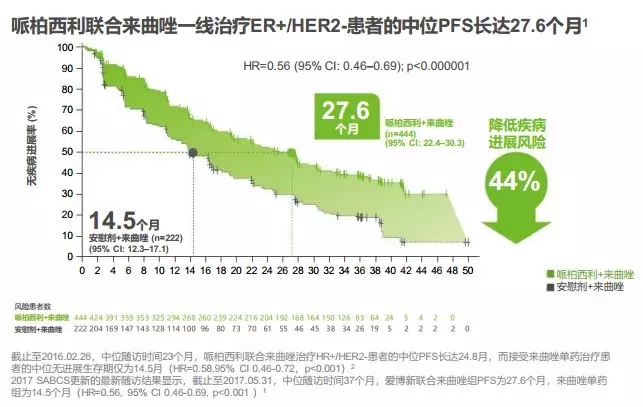 哌柏西利(爱博新?)是全球及我国首个上市的CDK4/6抑制剂,在II期临床研究PALOMA-1[1]中,哌柏西利+AI较单用AI显著延长10个月的无进展生存期(PFS),数值上延长3个月的总生存期(OS)。Ⅲ期临床研究PALOMA-2[2]证实,哌柏西利+AI有效延缓一线内分泌治疗耐药的发生,一线PFS可达到27.6个月。PALOMA-2 亚组分析发现,无论患者既往是否接受过内分泌治疗、无治疗间期(TFI)长短,PFS均有显著获益。哌柏西利可提升客观缓解率(ORR)和临床获益率(CBR),在具有可测量病灶人群中,ORR达55.3%,CBR达84.3%。