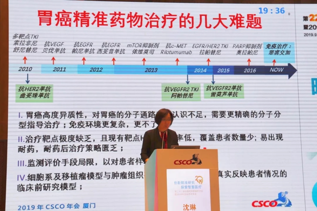 沈琳教授首先指出胃癌精准药物治疗的几大难题:胃癌高度异质性,对胃癌的分子通路变化认识不足,需要更精确的分子分型指导治疗;细胞系及移植瘤模型与肿瘤组织存在差别,缺乏能够真实反应患者情况的临床前研究模型;治疗靶点极度缺乏,且现有靶点HER2阳性率低,覆盖患者数量少,易出现耐药,耐药后治疗策略匮乏;监测评价手段有限,以对患者样本的回顾性分析为主。
