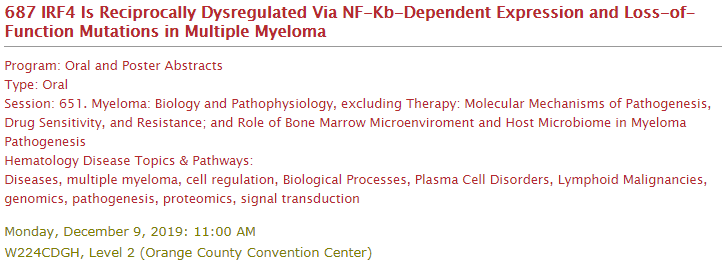 结论:IRF4在MM细胞中高表达,可能通过NF-κB依赖的机制作用于NF-κB信号通路的下游,直接作用于CIAP1和MCL-1从而产生耐药性(并非作用于MYC)。然而,在MM患者中的IRF4点突变(至少在某些赖氨酸位点)可能导致功能丧失,或许预示更好的生存结局。