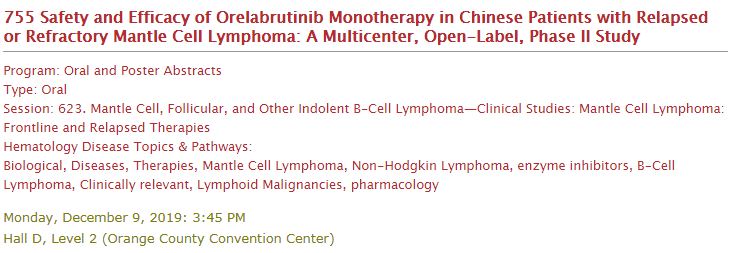 II期研究—— Orelabrutinib单药在中国复发难治套细胞淋巴(R/R-MCL)患者中的疗效及安全性
