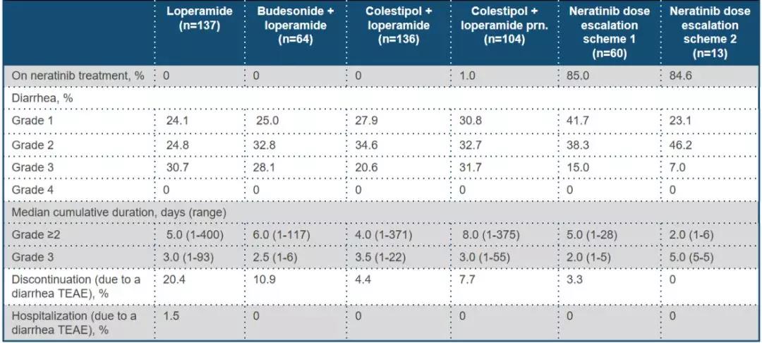 2019年SABCS大会上,一项国际多中心的2期试验(CONTROL)[3]探讨了不同的奈拉替尼相关腹泻管理方案:长期规律使用洛哌丁胺、布地奈德+洛哌丁胺或考来替泊+洛哌丁胺进行预防;必要时使用考来替泊+洛哌丁胺;奈拉替尼剂量递增+必要时使用洛哌丁胺。本次报道了奈拉替尼剂量递增组的更新数据。研究共纳入了514例患者,结果显示(见下表):与ExteNET(39.9%)相比,所有预防措施均可降低3级腹泻事件的发生率。在为期12个月的奈拉替尼治疗期间,3级腹泻的平均累积持续时间为2~5天。与ExteNET(16.8%)相比,除第1组(洛哌丁胺)外,所有队列中因腹泻而停用奈拉替尼的患者比例均有下降。导致停药的大多数不良事件(包括腹泻)发生在治疗早期,主要发生在第一或第二个周期。