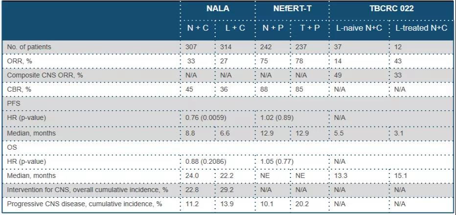 2019年SABCS大会上,Ahmad H Awada等对NALA、NEfERT-T和TBCRC022等三项研究进行汇总分析(见下表)[4]。在NALA中,奈拉替尼+卡培他滨组与拉帕替尼+卡培他滨组相比,需要对有症状的CNS转移进行干预的患者比例明显减少(22.8%vs.29.2%)。在NEfERT-T中,与曲妥珠单抗+紫杉醇组相比,奈拉替尼+紫杉醇组有症状或进展性CNS复发的频率显著降低(10.1%vs.20.2%)。在TBCRC 022中,在未接受过拉帕替尼治疗的CNS转移患者中,奈拉替尼治疗的ORR可达到49%,中位PFS和OS分别为5.5个月和13.3个月。丹娜法伯癌症研究所的Lin N.教授在本次大会上做了“乳腺癌脑转移系统治疗”的主题演讲,也肯定了TBCRC 022研究中奈拉替尼在CNS转移HER2阳性乳腺癌中的出色疗效[5]。