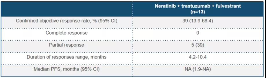 ExteNET研究中可见,HR+/HER2+患者是奈拉替尼治疗的优势获益人群;既往研究也已证实HER2和ER通路存在Crosstalk,三阳性患者可从抗HER2和内分泌治疗双重阻断中获益[6]。而HER突变型晚期乳腺癌,也有其独特的致癌机制。在此前的报道中,奈拉替尼联合氟维司群用于HER2突变,激素受体阳性晚期乳腺癌中,显示了良好的临床获益,客观缓解率达到30%。本次会议上,Hans Wildiers等报道了HR+/HER2-mutant转移性乳腺癌的2期篮子试验(SUMMIT)中奈拉替尼+曲妥珠单抗+氟维司群(N+T+F)联合治疗这一队列的更新数据[7],共有19例患者纳入了N+T+F队列。在13例可评估的患者中(见下表),N+T+F的客观缓解率可达39%,常见的不良事件仍然是腹泻,但没有患者因此停止治疗。该研究表明N+T+F是耐受性良好的联合方案,目前研究队列已经扩大至50例。此外,本次大会上一些基础研究的报道,也为HER2-TKI联合PI3K抑制剂或CDK4/6抑制剂在机制层面提供了依据,有待未来临床转化研究[8,9]。