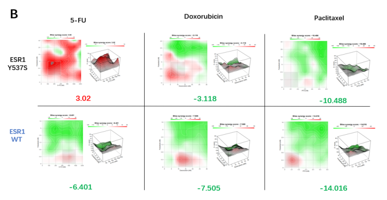 研究人员利用Bliss药物协同效应实验测试氟维司群与三种化疗药物(5-FU、阿霉素、紫杉醇)在MCF7、T47D、MCF7 Y537S、T47D Y537S细胞系以及MCF7 P53敲除细胞系中的药物相互作用,发现只有在P53野生型细胞中氟维司群与化疗具有药物协同作用,同时拥有Y537S突变的细胞系具有更高的协同效应分数,而无论P53突变还是P53敲除后,氟维司群与化疗均为拮抗作用(如图3)。