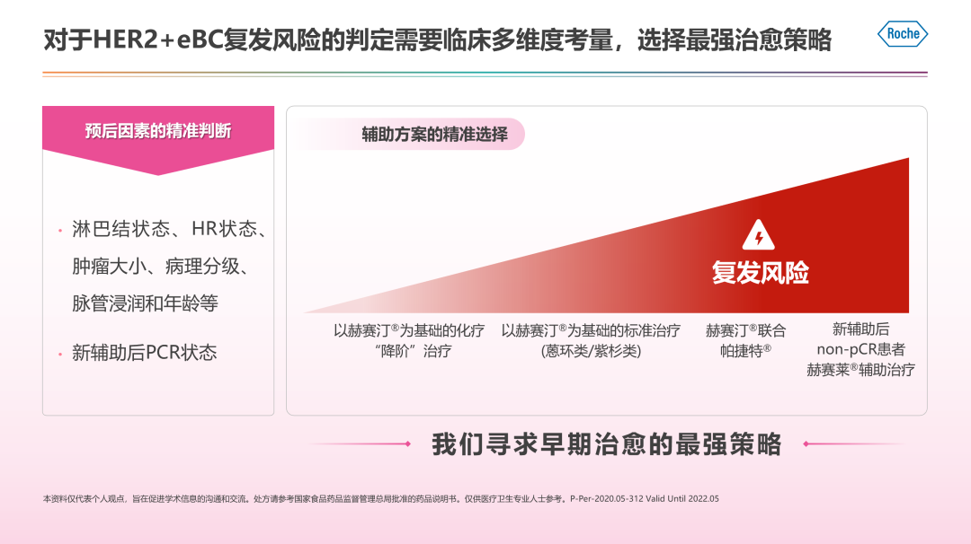 对于HER2阳性eBC,临床追求治愈。既往多项临床研究奠定了曲妥珠单抗辅助治疗的标准地位,为患者带来更多的治愈。但并非完全治愈,BCIRG 006研究显示约有25%的患者仍会在曲妥珠单抗治疗一年后复发,淋巴结阳性和HR阴性患者10年内复发率达到30%以上,随着淋巴结阳性数目增多,复发风险也越高,随着时间的进行,HR阴性患者比HR阳性更早复发,更多复发。所以如何把握患者的不同疾病状态、生物学特征,评估复发风险,进行多维度考量,对高风险人群选择早期治愈最强策略,是临床的追求。