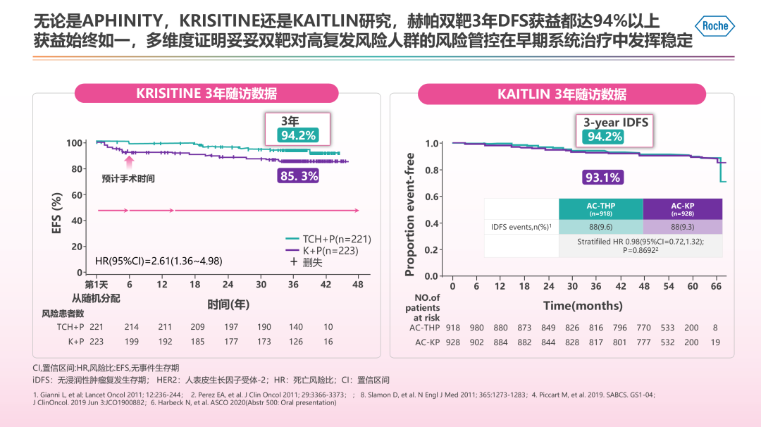 帕妥珠单抗的问世与曲妥珠单抗机制互补,充分阻滞了HER2活化。APHINITY研究重新定义了赫帕双靶在高复发风险HER2阳性eBC的标准治疗地位,开启了赫帕双靶时代。赫帕双靶联合化疗辅助治疗6年的iDFS率达到90.6%,持续保持优势。淋巴结阳性患者获益显著,6年复发风险降低28%,绝对获益达到4.5% ;无论激素受体状态如何,6年iDFS均接近90%,且都优于单靶组。相较于过去单靶时代,赫帕双靶升阶梯治疗的APHINITY研究、KRISITINE研究、KAITLIN研究无病生存均超过90%,多维度证实了赫帕双靶对高复发风险人群长期、稳定、有效的疾病控制作用。