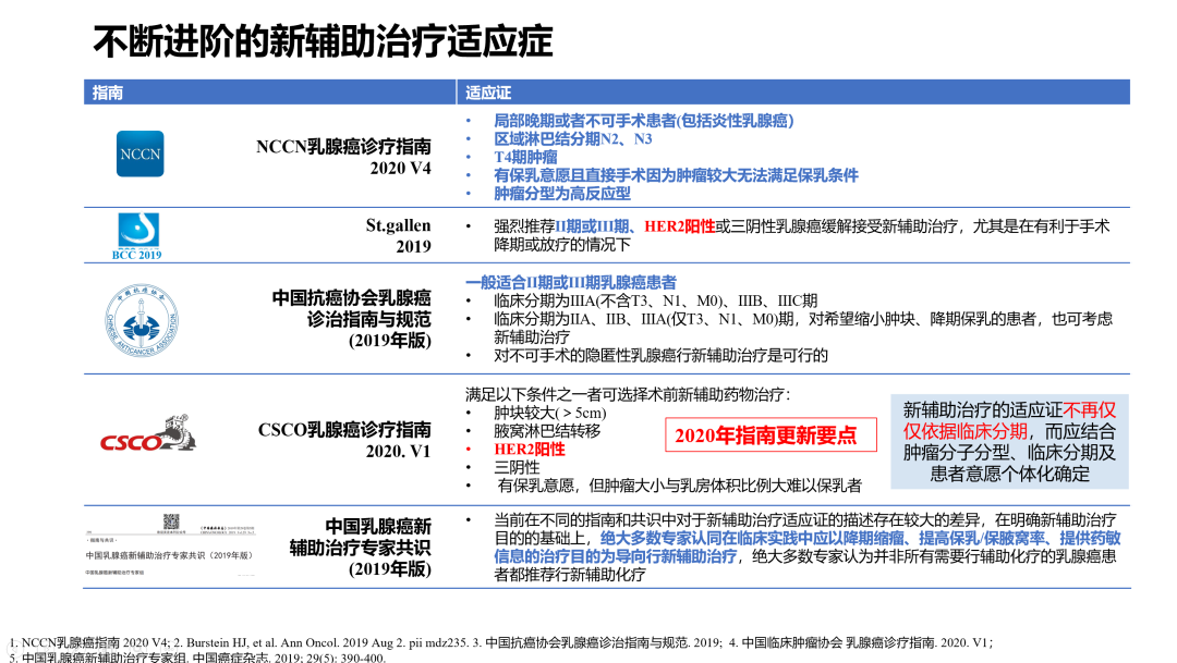 HER2阳性乳腺癌的变革主要诠释了HER2阳性乳腺癌通过标准且足疗程的新辅助治疗探索药敏,以pCR状态为新的临床治疗决策点,精准升阶辅助治疗方案帮助更多高复发风险的患者能够被治愈。既往新辅助治疗的目的更多的是服务于手术,提高手术机会、增加保乳率。而在2000年前后,新辅助治疗增加了药敏实验平台的意义,基于此项变革,新辅助治疗的患者比例在逐年升高,国内外各大指南也对新辅助治疗适应症有了相应调整,2020年CSCO BC指南特别指出:新辅助治疗的适应症不再仅仅依据临床分期,而应结合肿瘤分子分型、临床分期及患者意愿进行综合性的判定,并同步强调HER2阳性乳腺癌的新辅治疗具有非常重要的意义。