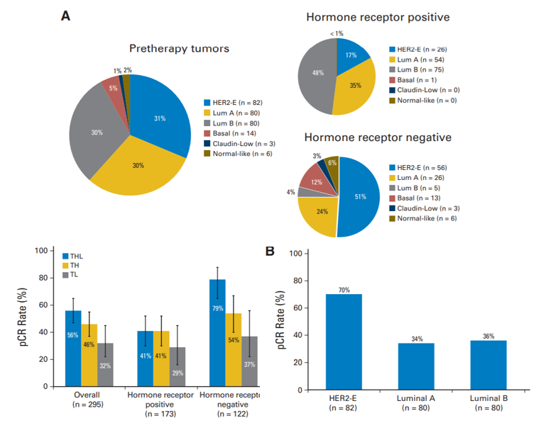 2016年刊载于JCO的主要终点报告显示,拉帕替尼双靶组较曲妥珠单抗的pCR率有所提高(56% vs 45%,P=0.13),无统计学意义;但激素受体阴性、HER2基因扩增、p53基因突变、某些免疫细胞浸润的亚组患者可显著提高。