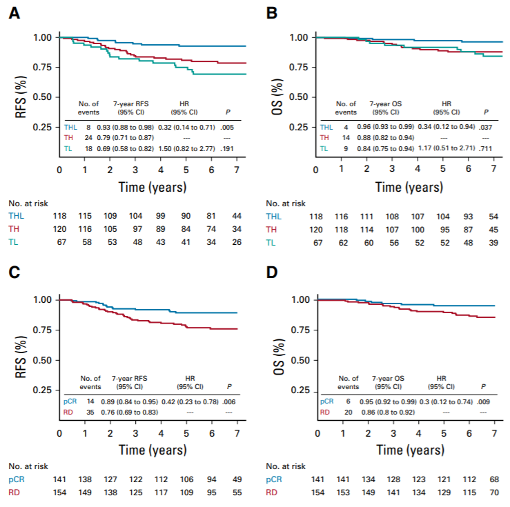 中位随访83个月,TL组、TH组和THL组的复发事件数分别为18(26.9%)、24(20%)和8(6.8%),7年RFS率分别为69%(95%CI:58~82)、79%(71~87)和93%(88~98);THL组相较于TH组的复发风险有显著差异(HR=0.32,95%CI:0.14~0.71,P=0.005)。