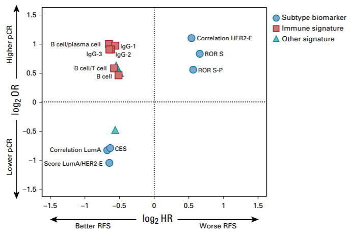 研究还用688个基因来建立可以预测pCR和RFS的模型。结果显示有215个基因(31.25%)与pCR显著相关,与此前的报道一致,HER2富集标记物、PAM50复发风险、ERBB2基因表达和B细胞/免疫球蛋白G(IgG)免疫标志物为pCR的正性预测因子,而ESR1基因表达、管腔A型、管腔肿瘤评分、化学内分泌评分(CES)和LumA-HER2-E评分等为负性预测因子。