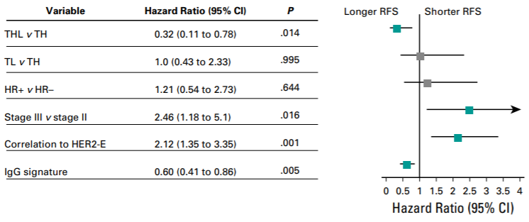 此外,HER2富集或lgG低的RD患者与更短的RFS显著相关。在多变量Cox分析中,lgG仍是独立的良好预后因素(HR=0.60;95%CI:0.41~0.86;P=0.005),而HER2富集的RD患者RFS明显较差(HR=2.12;95%CI:1.35~3.35;P=0.001)。值得注意的是,激素受体状态与RFS无显著相关性。