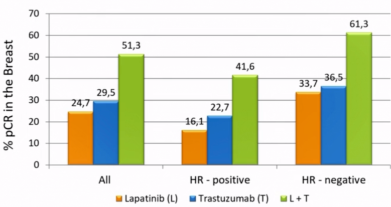 NeoALTTO研究亚组分析显示,经T+L治疗患者中HR-人群pCR率更高,达pCR者OS率更高