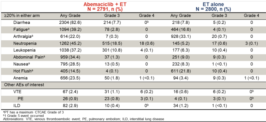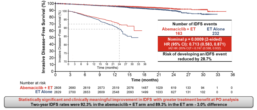 ITT人群中,iDFS的主要终点分析显示,abemaciclib+ET组与ET组相比,iDFS风险降低28.7%(HR 0.713,95%Cl:0.583~0.871),有统计学意义和临床意义的改善,2年iDFS率提高3.0%(阿贝西利组为92.3%,对照组为89.3%),提示其具有更大的治疗效益。