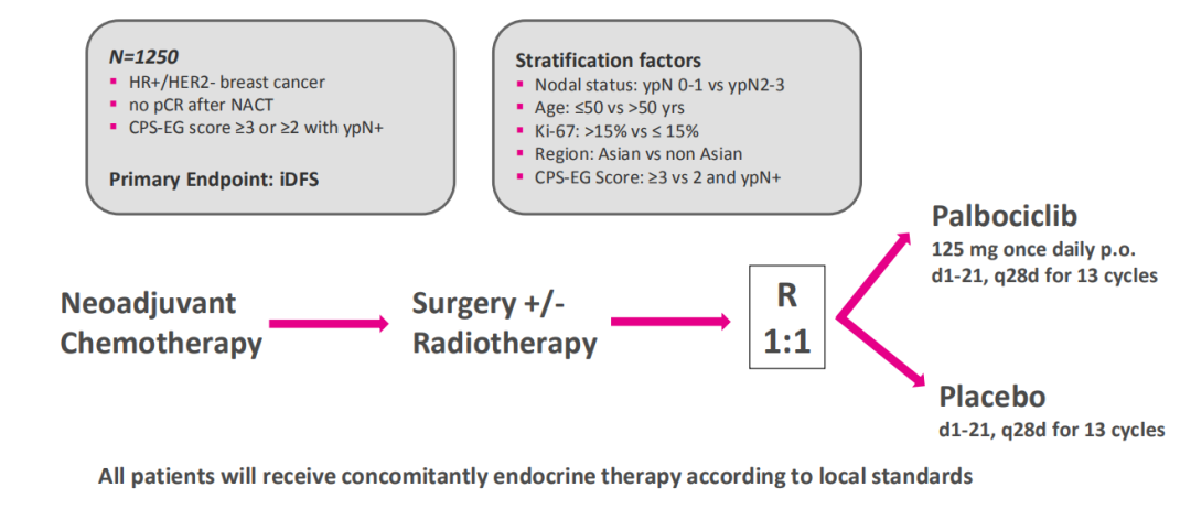 这项双盲安慰剂对照的Ⅲ期临床研究,把患者分成了两组,除了在新辅助之后接受标准的内分泌治疗以外,试验组接受了Palbociclib 125毫克口服给药的治疗,用三周停一周,治疗时间为一年。