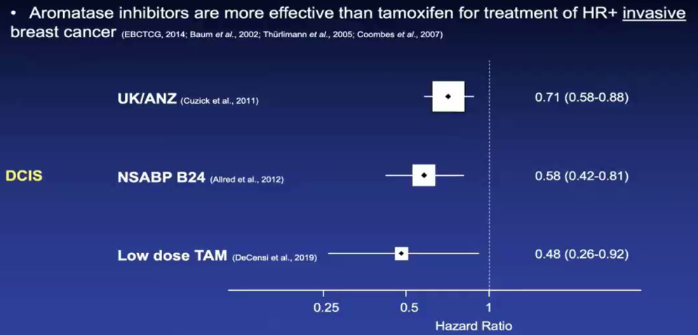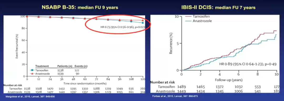 该项研究是IBIS-Ⅱ临床研究的进一步随访结果。IBIS-Ⅱ和NSABP B-35都是探索芳香化酶抑制剂和他莫昔芬对照在DCIS患者当中的疗效的研究,但它们的结果却有所不同,在NSABP B-35中有阳性的结果,阿那曲唑获益要多一点,而在IBIS-Ⅱ临床研究当中,却没有看到大的差异。