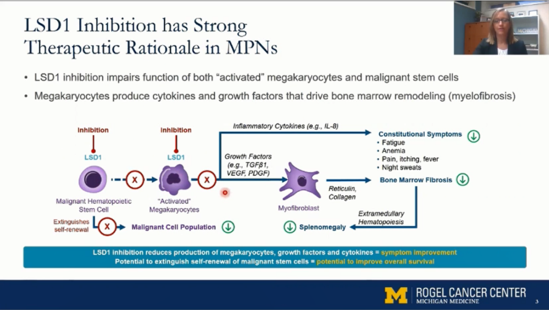 LSD1是一种对巨核细胞的成熟和正常活动以及恶性造血干/祖细胞的自我更新至关重要的表观遗传修饰酶,被认为是骨髓纤维化(MF)的致病生长因子和细胞因子的主要来源。IMG-7289(Bomedemstat)作为口服小分子LSD1抑制剂,主要通过同时增加P53的表达和甲基化、独立地通过促凋亡因子PUMA并降低抗凋亡拮抗剂BCLXL的水平,选择性抑制JAK2V617F细胞的增殖并诱导其凋亡,因此其在MF患者的治疗中理论上是可行的,前期前临床试验也为其提供了依据。本项研究显示了口服药物IMG-7289可改变晚期MF患者症状、脾脏体积、贫血、骨髓纤维化,减少1/3患者的等位基因突变频率,尤其是ASXL1,表现出良好的安全性、有效性和耐受性,后期可在前临床试验及此试验基础上进一步对ET和PV患者进行研究,此外针对IMG-7289联合 芦可替尼对MPN的研究也是一个新的方向。