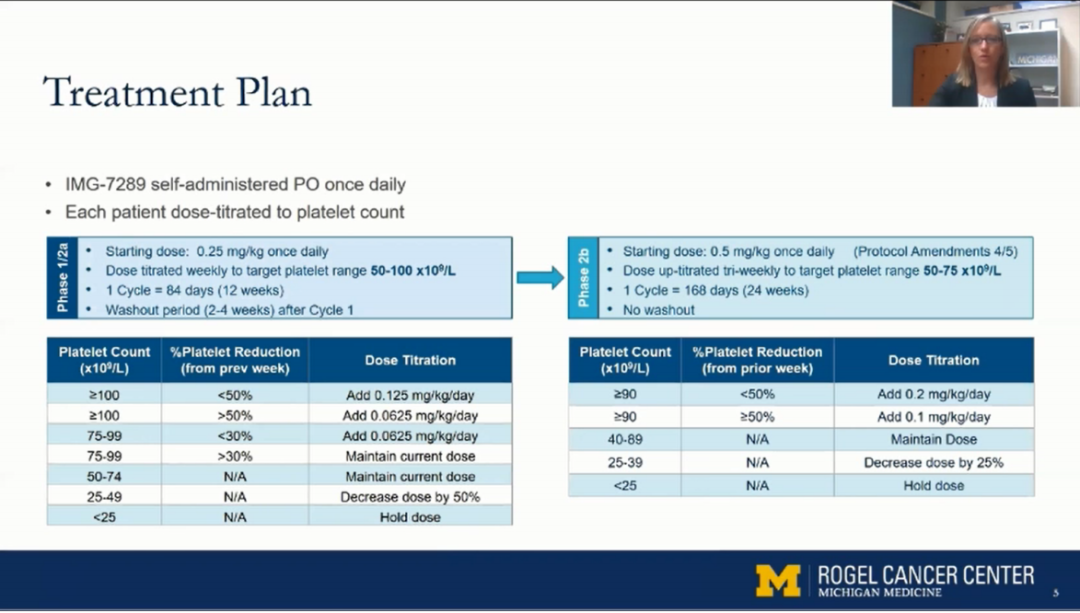本研究患者每日口服IMG-7289,起始剂量0.25mg;每周滴定血小板控制在(50-100)×109/L;周期为84天;每周期后2-4周洗脱期。IIb期研究设定设定目标人群每日口服IMG-7289,起始剂量0. 5mg/kg;每3周滴定血小板控制在(50-75)×109/L;周期为168天。