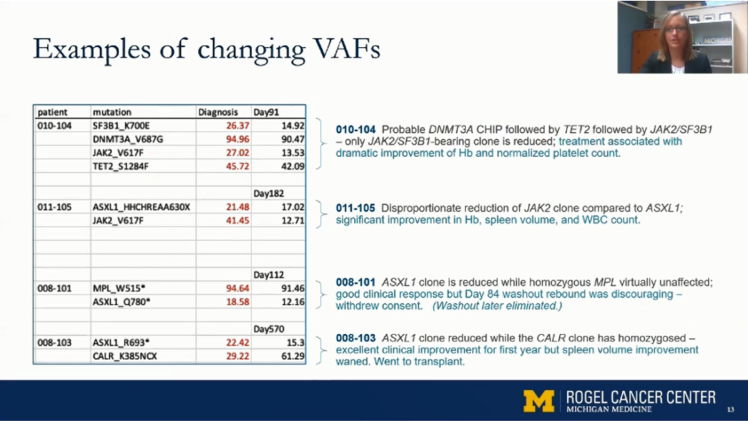 IMG-7289在晚期MF患者中安全且耐受性良好;IMG-7289单药治疗晚期MF患者具有临床有效:临床症状、脾脏体积、贫血、骨髓纤维化不同程度改善;IMG-7289能减少1/3VAF,尤其是ASXL1突变;治疗期间无新的基因突变或进展为AML。