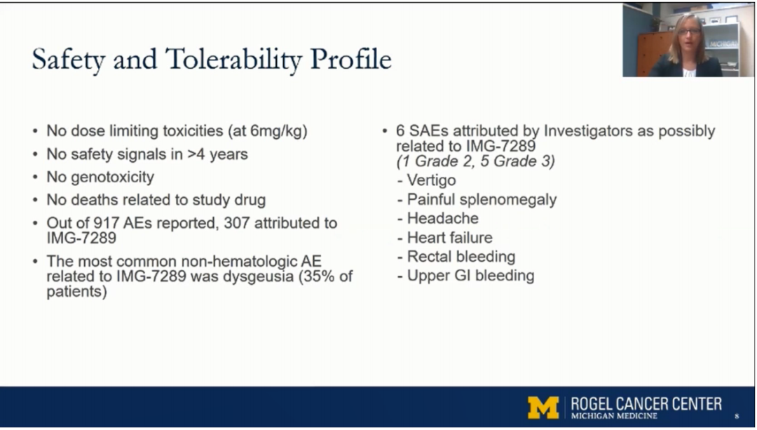 安全性方面:38例(95%)报告771例不良事件,其中33例为SAEs。被认为可能与IMG-7289有关主要不良反应为:脾肿痛、直肠出血、心力衰竭和头痛。亦无无剂量限制性毒性、药物相管的死亡或发展为AML。