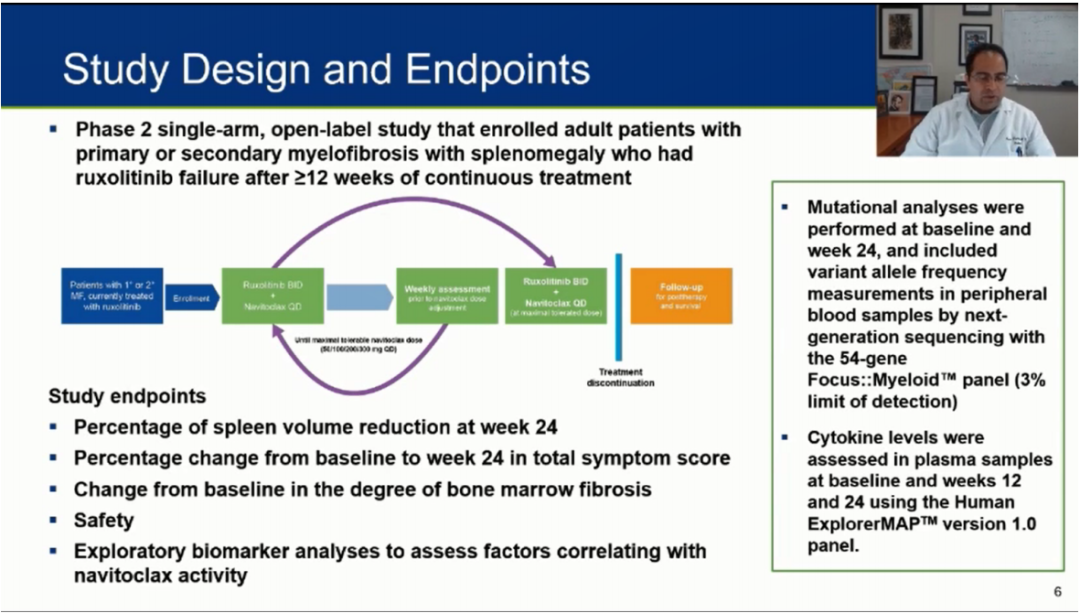 Navitoclax是一种新的口服的抗凋亡蛋白 BCL-XL和BCL-2抑制剂。临床前的研究显示:JAK2和BCL-XL/BCL-2抑制剂联用,可以克服获得性JAK抑制剂耐药。既往对芦可替尼没有反应的骨髓纤维化(MF)患者,治疗选择有限。navitoclax (Nav)和 芦可替尼 (NCT03222609)的联用,对不再受益于 芦可替尼的MF患者,可诱导有临床意义的脾脏体积(SVR)应答、总症状评分(TSS)改善和骨髓纤维化(BMF)分级降低。本II期临床研究旨在评估1.HMR的存在或研究开始时突变的基因总数是否与临床结果(SV降低≥35%[SVR35]、TSS和BMF降低)和驱动基因(JAK2 p.V617F和突变的CALR)变异等位基因频率(VAF)降低相关。2.评估Nav+ 芦可替尼是否能改变MF炎性细胞因子水平及后者与临床结果的相关性。