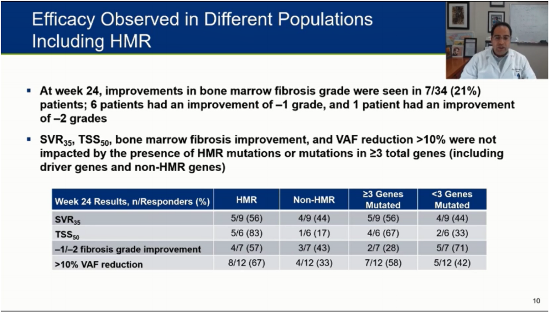 在治疗第24周,9/34(27%)达到SVR35, 6/20(30%) TSS (TSS50)降低≥50%,7/34 (21%)BMF有-1/-2级改善,12/26(46%)>有10%的驱动基因VAF减少。观察到第24周的临床反应和VAF减少与HMR突变的存在和突变的基因数量无关。进一步的分析发现β-2微球蛋白(B2M),肿瘤坏死因子受体2(TNFR2)、金属蛋白酶组织抑制剂1 (TIMP-1)和血管细胞粘附分子1(VCAM-1)4种细胞因子与TSS的改善有关。