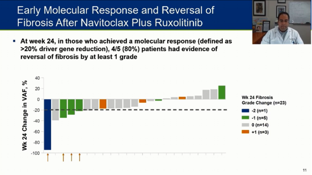 MF(骨髓纤维化)是一种主要由JAK/STAT信号驱动的骨髓增殖性肿瘤,伴随着生长转录因子、炎性因子、抗凋亡蛋白BCL-XL等的增加。很多患者在JAK抑制剂治疗后复发,长期有效药物有限;具有高分子风险(HMR)突变(定义为ASXL1、SRSF2、EZH2、U2AF1和IDH1/2突变)的MF患者的总生存期缩短和/或白血病转化风险也同时会增加增加。在对芦可替尼失去反应的骨髓纤维化(MF)患者中,navitoclax和 芦可替尼 (NCT03222609)的联合应用,在不再受益于 芦可替尼的MF患者中,可诱导有临床意义的脾脏体积(SVR)应答、总症状评分(TSS)改善和骨髓纤维化(BMF)分级降低。但这些与VAF减少与HMR突变的存在和突变的基因数量无关。正在进行的细胞因子分析表明,navitoclax+ 芦可替尼联合应用可能在改善关键细胞因子方面发挥作用,这些细胞因子参与了单纯 芦可替尼反应不佳的MF患者TSS的改善。