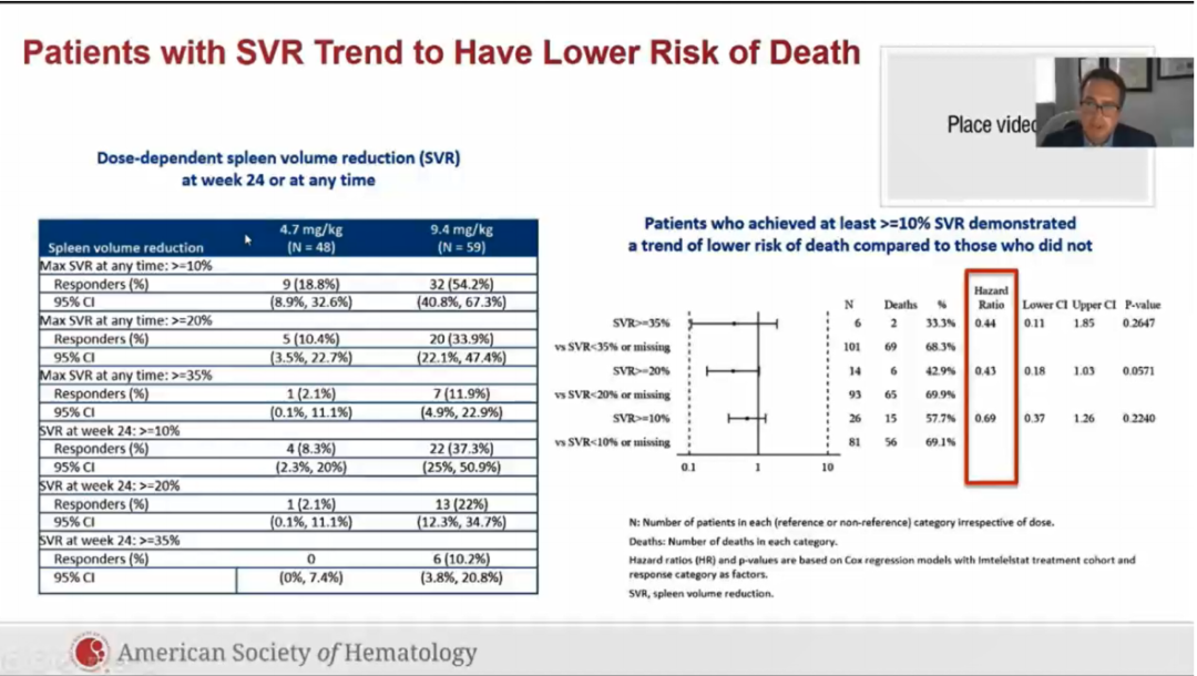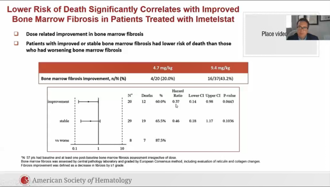 在第24周达到症状反应的患者,与未达到症状缓解或未评估的患者相比,具有更长的OS趋势(HR = 0.79,95%CI 0.41-1.51)。在第24周达到脾脏反应的患者中观察到相似趋势(HR = 0.46,95%CI 0.11-1.92)。此外,与≤20%SVR降低相比,≥20%SVR与更好的OS趋势相关(HR = 0.44,95%CI 0.19-1.04)。SVR临界值≥10%时趋势仍然存在(HR = 0.69,95%CI 0.38-1.27),与已发表的数据一致。在有骨髓资料的57例患者中,19例患者(33%)在研究期间骨髓纤维化改善≥1度,OS显著长于骨髓纤维化恶化的患者(HR = 0.36,95%CI 0.13-0.96 p = 0.04)。在纤维化稳定与恶化的30例患者(53%)中观察到相似趋势(HR = 0.47,95%CI 0.19-1.20)。