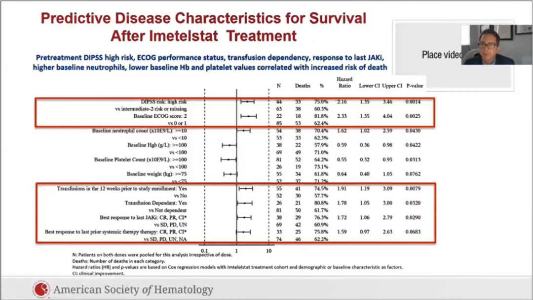 一些基线疾病特征因素被确定为生存的预后因素,与治疗剂量无关。治疗前DIPSS高风险、ECOG体能状态、输血依赖性、基线中性粒细胞升高、基线Hb和血小板值降低,均与死亡风险增加相关。