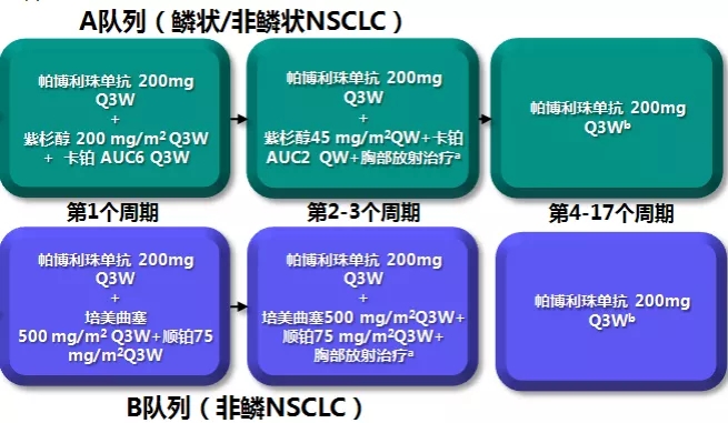 A组:患者接受1周期卡铂(AUC6)+紫杉醇(200mg/m2)+Pembro(200mg Q3W)治疗;3周后,患者接受卡铂(AUC2 QW)+紫杉醇(45mg/m2 QW)共6周,以及Pembro(200mg Q3W)2个周期加标准胸部放疗(TRT);
