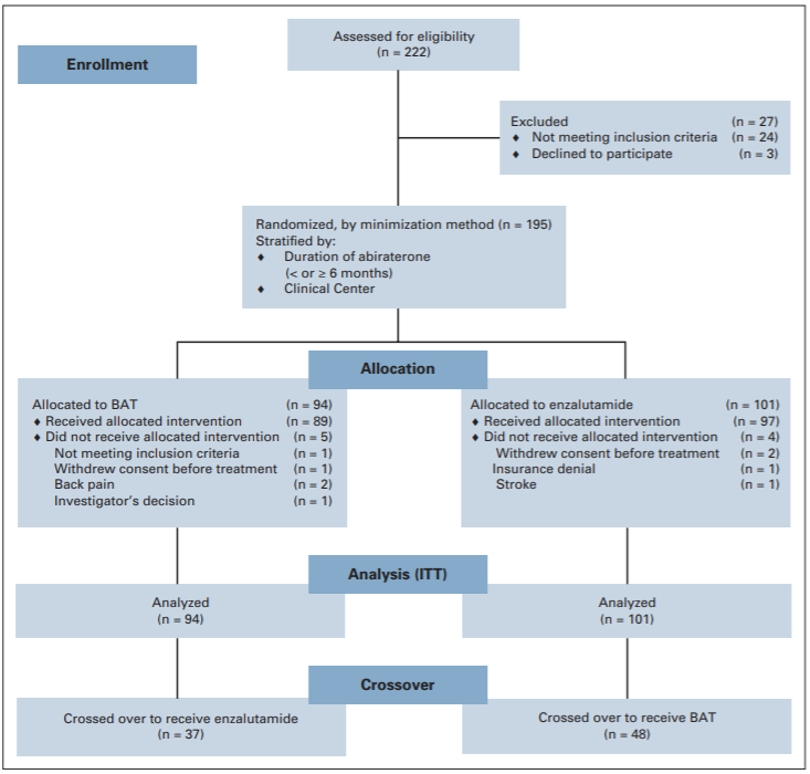 该研究共入组195例经阿比特龙治疗发生进展的CRPC患者,随机分为BAT组(n=94)和恩扎卢胺组(n=101)。主要终点为临床或影像学无进展生存期(PFS);进展期允许交叉。次要终点包括总生存期(OS)、无PSA进展生存(PSA-PFS)、客观缓解率(ORR)、随机交叉(PFS2)的PFS、安全性和生活质量(QoL)。