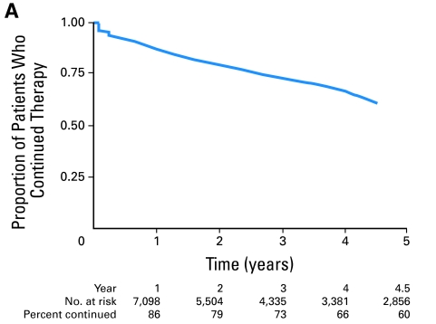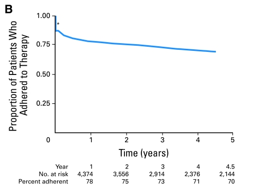 △ A、1996年至2006年,在北加州凯萨医疗机构(KPNC)开始治疗的8769名Ⅰ-Ⅲ期激素受体阳性乳腺癌患者继续进行激素治疗的Kaplan-Meier曲线。B、1996年至2006年在KPNC继续辅助治疗的5979例Ⅰ-Ⅲ期激素受体阳性乳腺癌患者激素治疗依从性的Kaplan-Meier曲线。