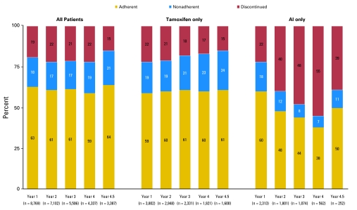 研究数据显示,很大比例的女性患者没有坚持辅助内分泌治疗;70%的女性在5年内有最佳的依从性,极端年龄组和改变AET用药与不依从轨迹相关;4%的女性遵循了“持续欠佳的依从性”轨迹,这在此前文献中未被发现。
