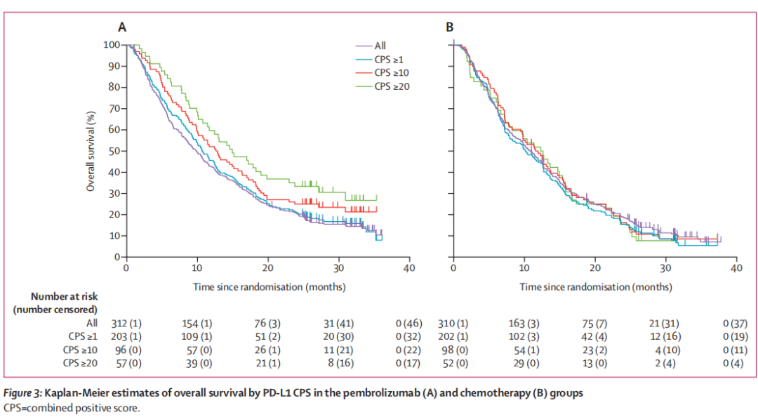 △图3:Kaplan-Meier对pembrolizumab(A)组和化疗(B)组PD-L1 CPS总生存率的估计