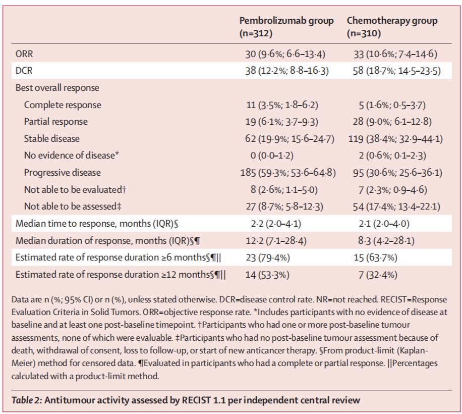 pembrolizumab组vs.化疗组:17(18%)/96 vs. 9(9%)/98。