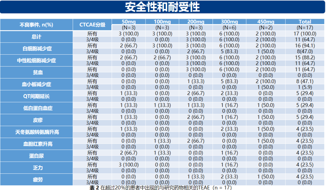研究结果:截止至2020年8月10日,一共有17例患者参加了1a期临床研究。其中,曾接受内分泌治疗和化疗的患者分别为16例(94.1%)和13例(76.5%)。450 mg剂量组中的两例患者发生了DLT事件,分别为4级血小板减少症和4级中性粒细胞减少症,在其他剂量水平上均未观察到DLT。出现次数最多的是血液学TEAE:白细胞减少症(16/17,94.1%),中性粒细胞减少症(15/17,88.2%),贫血(11/17,64.7%)和血小板减少症(8/17,47.1%)。主要3-4级TEAE为中性粒细胞减少症和白细胞减少症,分别发生于11例(64.7%)和8例(47.1%)例患者中。
