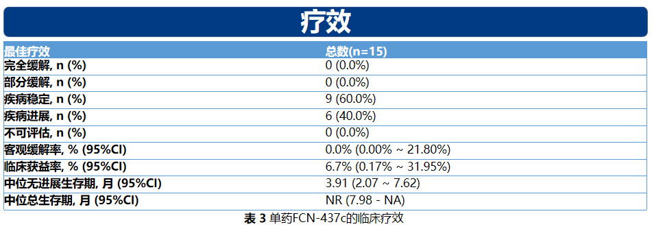在连续给药50mg到200mg剂量水平中,暴露量(Cmax,AUC0-∞,AUC0-24,Cav-ss 24h)基本与给药量成比例增加。在连续给药200 mg到450 mg剂量水平,暴露量有饱和趋势。FCN-437c单药治疗的MTD确定为300 mg,根据安全性和PK数据将RP2D确定为200 mg。在15例可评估患者中有9例(60.0%)疾病稳定,但未观察到疗效。由于随访时间短,PFS和OS的数据尚未成熟。